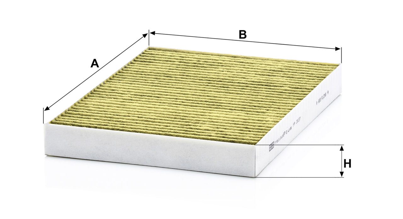 Biofunctional MANN-FILTER FreciousPlus cabin air filters - nearly 100% protection against nitrogen oxides, dust, allergens and mould - harmful gases and unpleasant odours are also eliminated and virus aerosols filtered. The three-layer filter technology absorbs almost 100% of allergens, reduces the growth of molds and bacteria by more than 98% and stops fine dust almost completely.Specification