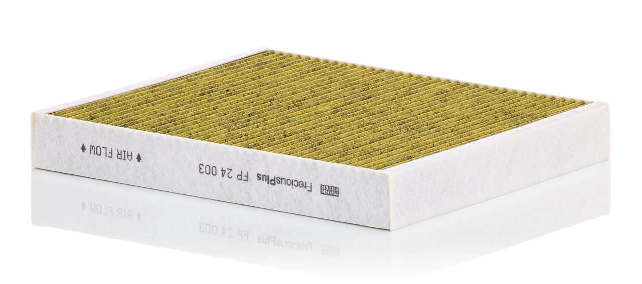 Biofunctional MANN-FILTER FreciousPlus cabin air filters - nearly 100% protection against nitrogen oxides, dust, allergens and mould - harmful gases and unpleasant odours are also eliminated and virus aerosols filtered. The three-layer filter technology absorbs almost 100% of allergens, reduces the growth of molds and bacteria by more than 98% and stops fine dust almost completely.Specification