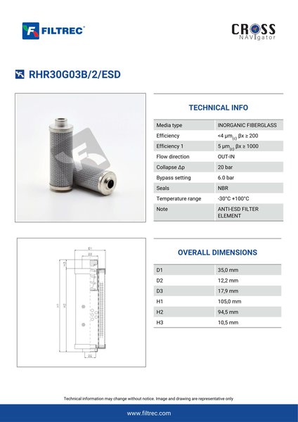 The efficiency of the element is shown using the Micron (µ) and Beta (β) ratings. The micron rating indicates the size of the particle being filtered and the beta rating the efficiency, calculated as 1/β.