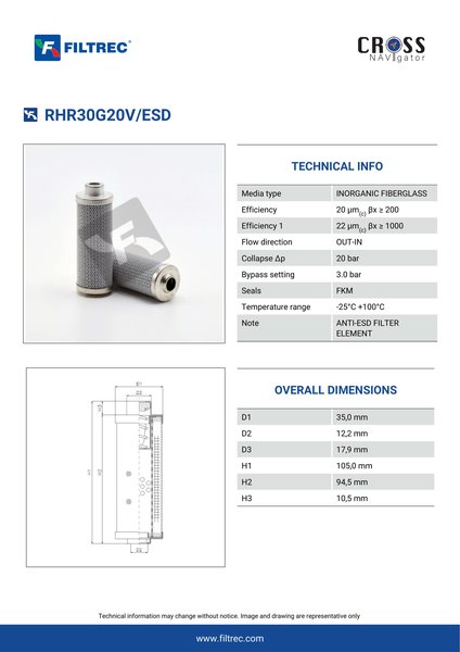 Genuine Filtrec RHR30G20V/ESD. This Filtrec element is designed to meet or exceed the quality and performance of brand OEM’s ensuring superior filtration performance and long-lasting durability.Engineered with their high performance media and a durable design, the RHR30G20V/ESD provides reliable and consistent performance over its lifespan, even in harsh operating environments. When you order from FilterFinder, you can trust that you are getting a reliable and high-quality replacement filter that will keep your system running smoothly.