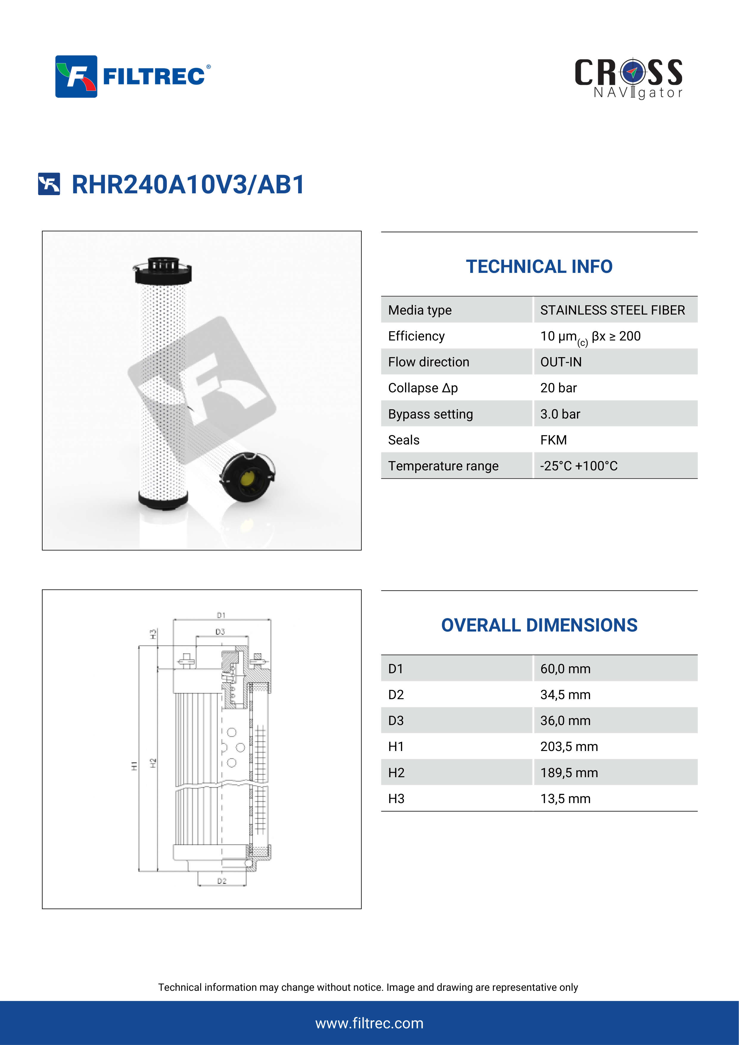 Genuine Filtrec RHR240A10V3/AB1. This Filtrec element is designed to meet or exceed the quality and performance of brand OEM’s ensuring superior filtration performance and long-lasting durability.Engineered with their high performance media and a durable design, the RHR240A10V3/AB1 provides reliable and consistent performance over its lifespan, even in harsh operating environments. When you order from FilterFinder, you can trust that you are getting a reliable and high-quality replacement filter that will keep your system running smoothly.