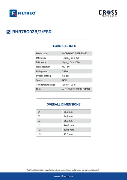 The efficiency of the element is shown using the Micron (µ) and Beta (β) ratings. The micron rating indicates the size of the particle being filtered and the beta rating the efficiency, calculated as 1/β.