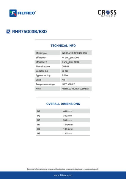 The efficiency of the element is shown using the Micron (µ) and Beta (β) ratings. The micron rating indicates the size of the particle being filtered and the beta rating the efficiency, calculated as 1/β.