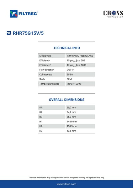 Genuine Filtrec RHR75G15V/5. This Filtrec element is designed to meet or exceed the quality and performance of brand OEM’s ensuring superior filtration performance and long-lasting durability.