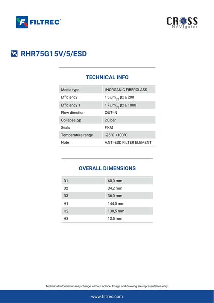 Genuine Filtrec RHR75G15V/5/ESD. This Filtrec element is designed to meet or exceed the quality and performance of brand OEM’s ensuring superior filtration performance and long-lasting durability.