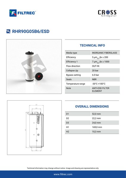 Engineered with their high performance media and a durable design, the RHR90G05B6/ESD provides reliable and consistent performance over its lifespan, even in harsh operating environments. When you order from FilterFinder, you can trust that you are getting a reliable and high-quality replacement filter that will keep your system running smoothly.