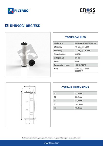 The efficiency of the element is shown using the Micron (µ) and Beta (β) ratings. The micron rating indicates the size of the particle being filtered and the beta rating the efficiency, calculated as 1/β.