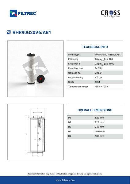 Genuine Filtrec RHR90G20V6/AB1. This Filtrec element is designed to meet or exceed the quality and performance of brand OEM’s ensuring superior filtration performance and long-lasting durability.Engineered with their high performance media and a durable design, the RHR90G20V6/AB1 provides reliable and consistent performance over its lifespan, even in harsh operating environments. When you order from FilterFinder, you can trust that you are getting a reliable and high-quality replacement filter that will keep your system running smoothly.