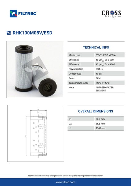 Genuine Filtrec RHK100M08V/ESD. This Filtrec element is designed to meet or exceed the quality and performance of brand OEM’s ensuring superior filtration performance and long-lasting durability.Engineered with their high performance media and a durable design, the RHK100M08V/ESD provides reliable and consistent performance over its lifespan, even in harsh operating environments. When you order from FilterFinder, you can trust that you are getting a reliable and high-quality replacement filter that will keep your system running smoothly.