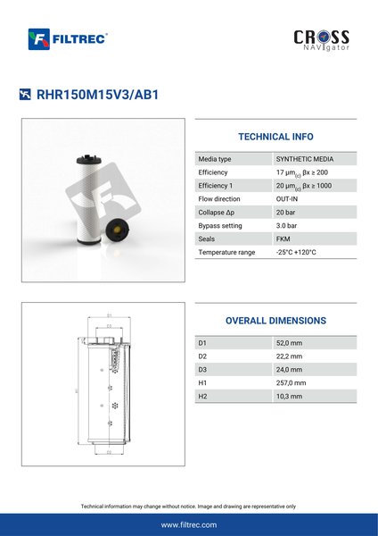 The efficiency of the element is shown using the Micron (µ) and Beta (β) ratings. The micron rating indicates the size of the particle being filtered and the beta rating the efficiency, calculated as 1/β.