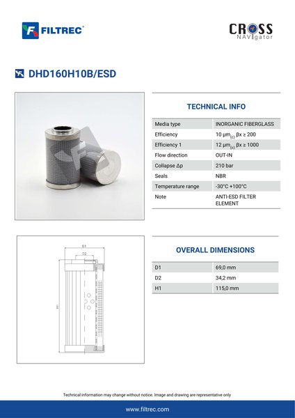 Genuine Filtrec DHD160H10B/ESD. This Filtrec element is designed to meet or exceed the quality and performance of brand OEM’s ensuring superior filtration performance and long-lasting durability.Engineered with their high performance media and a durable design, the DHD160H10B/ESD provides reliable and consistent performance over its lifespan, even in harsh operating environments. When you order from FilterFinder, you can trust that you are getting a reliable and high-quality replacement filter that will keep your system running smoothly.