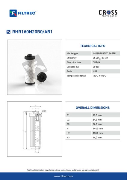 Genuine Filtrec RHR160N20B0/AB1. This Filtrec element is designed to meet or exceed the quality and performance of brand OEM’s ensuring superior filtration performance and long-lasting durability.Engineered with their high performance media and a durable design, the RHR160N20B0/AB1 provides reliable and consistent performance over its lifespan, even in harsh operating environments. When you order from FilterFinder, you can trust that you are getting a reliable and high-quality replacement filter that will keep your system running smoothly.