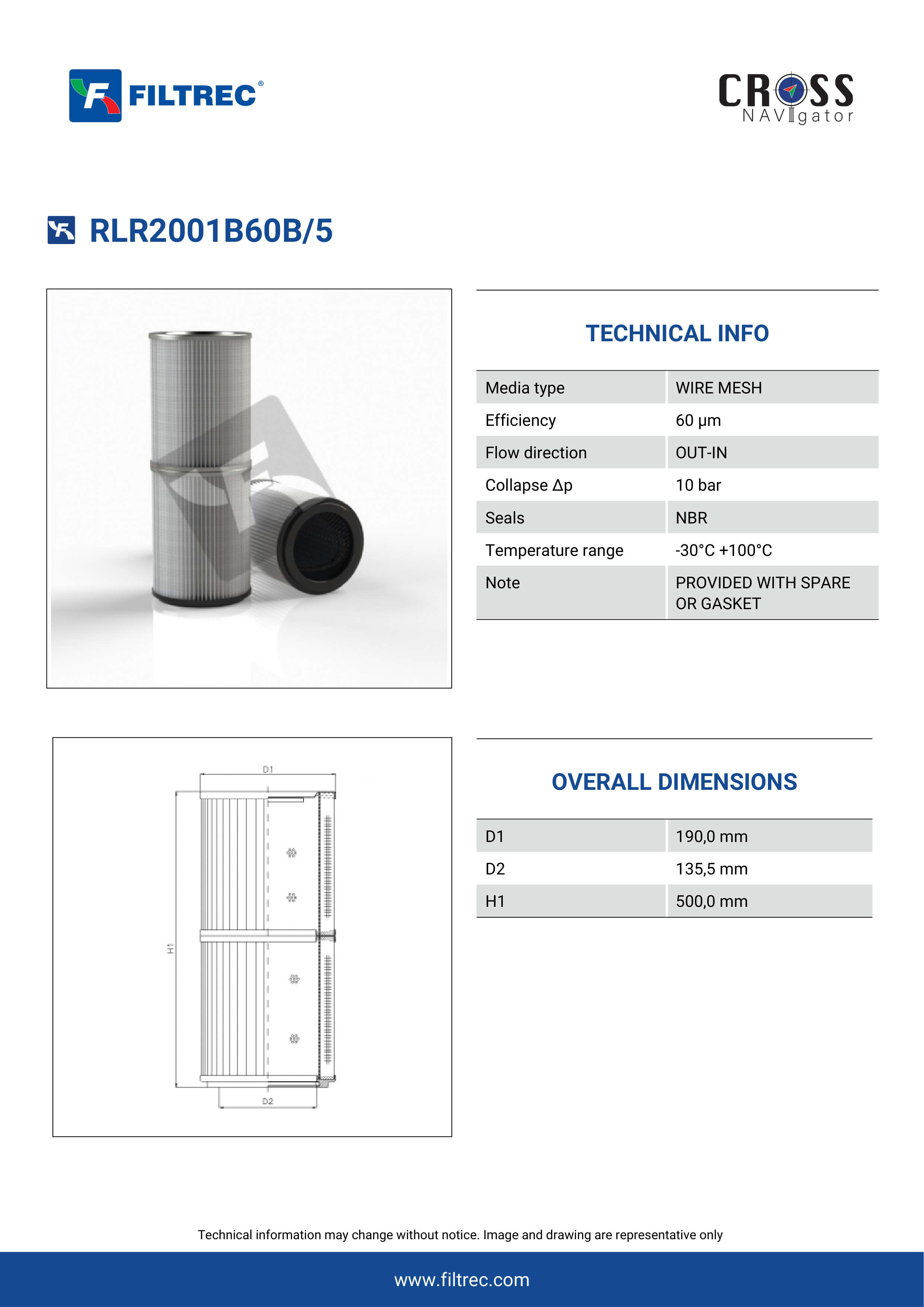 Genuine Filtrec RLR2001B60B/5. This Filtrec element is designed to meet or exceed the quality and performance of brand OEM’s ensuring superior filtration performance and long-lasting durability.