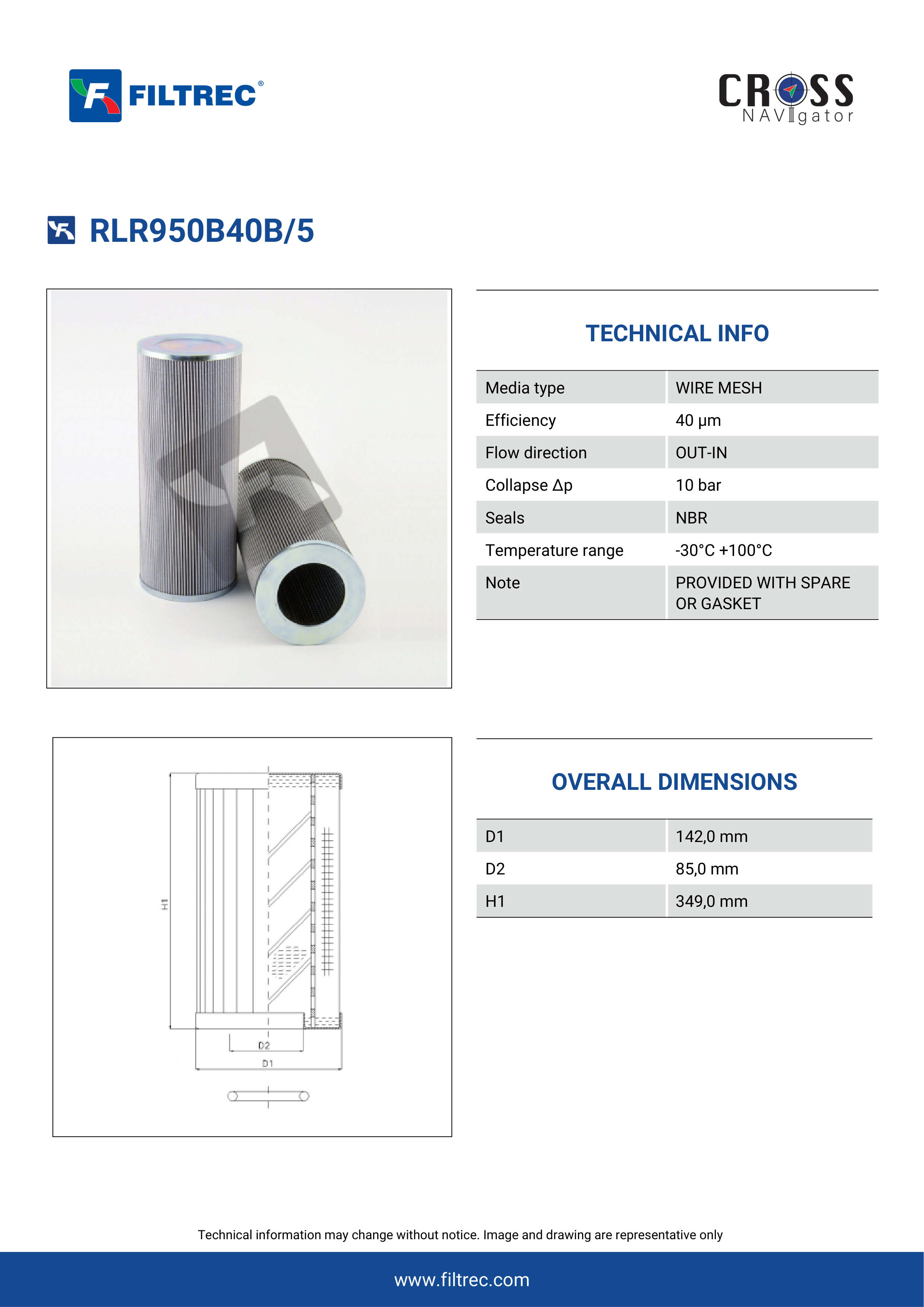 Filtrec RLR950B40B/5 Replaces the Internormen 01E95040G10EP