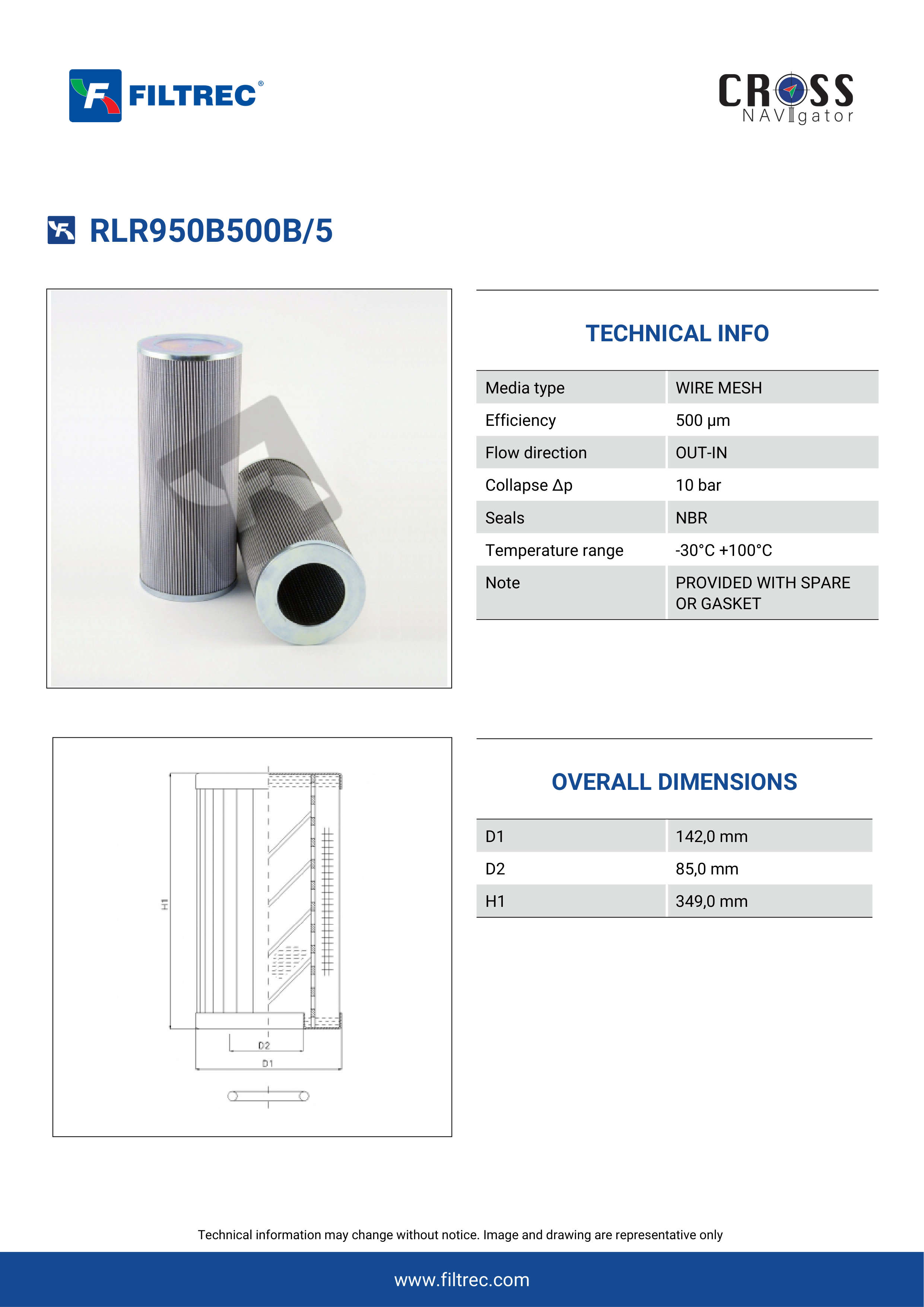 Genuine Filtrec RLR950B500B/5. This Filtrec element is designed to meet or exceed the quality and performance of brand OEM’s ensuring superior filtration performance and long-lasting durability.