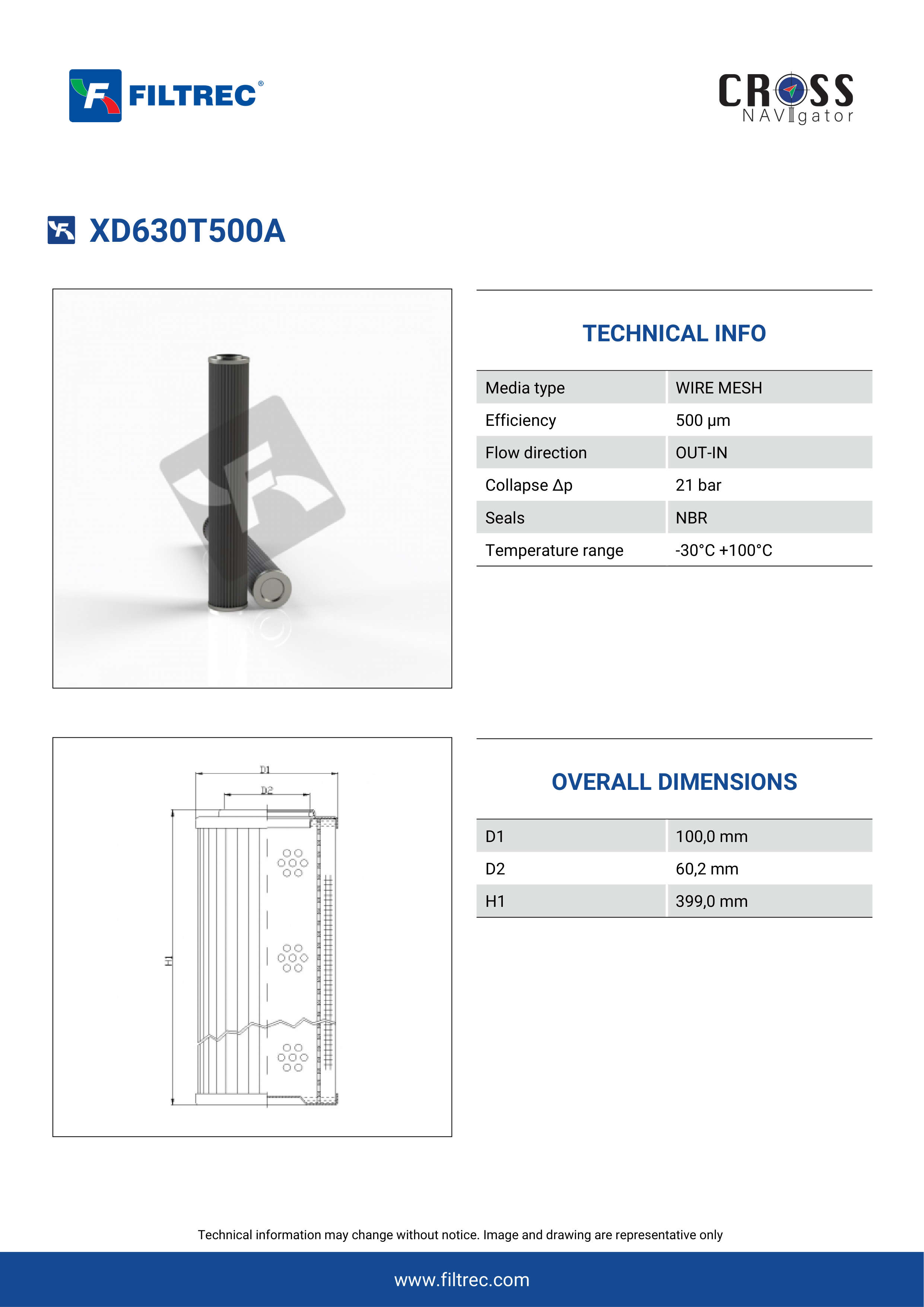 Genuine Filtrec XD630T500A. This Filtrec element is designed to meet or exceed the quality and performance of brand OEM’s ensuring superior filtration performance and long-lasting durability.