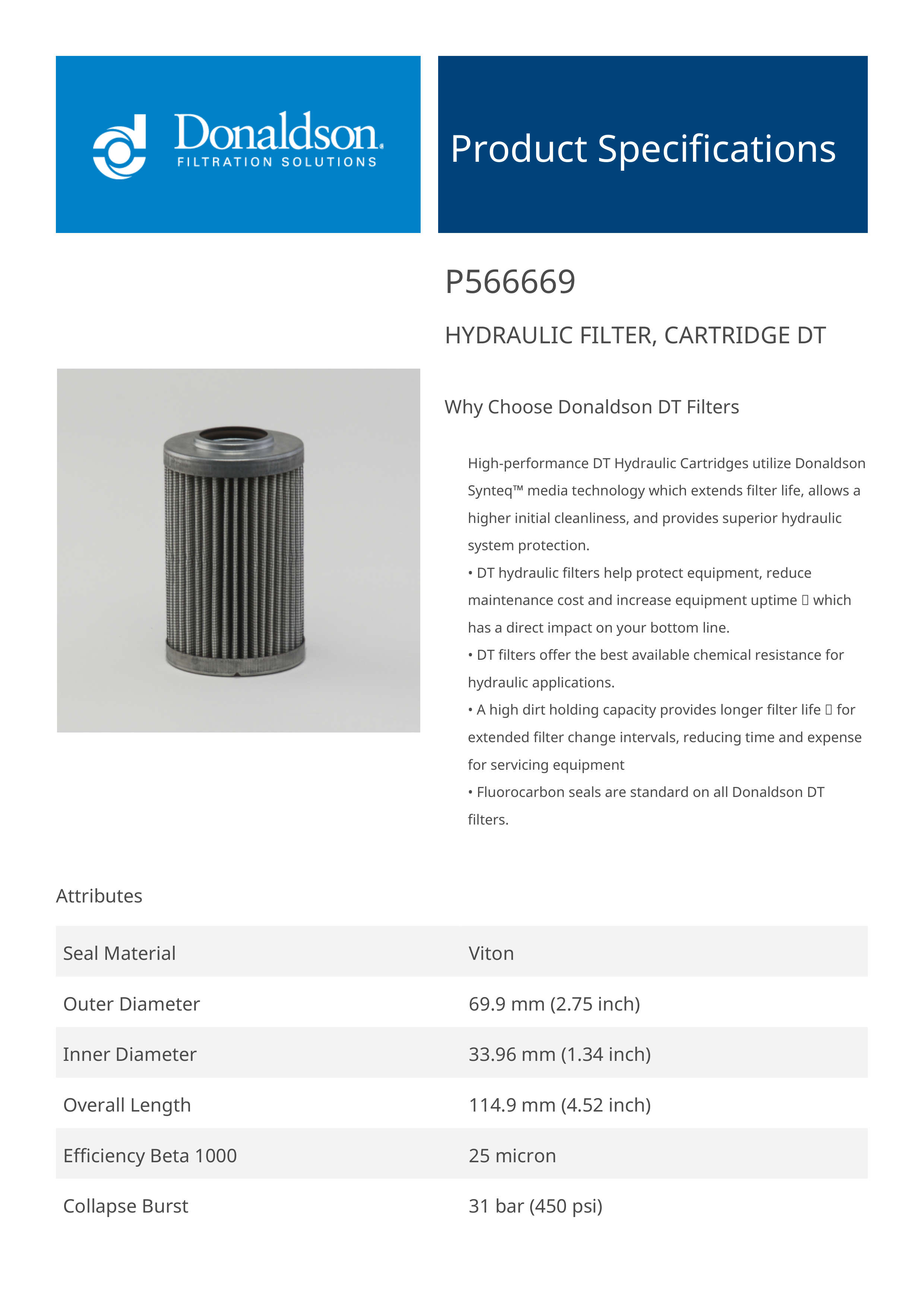 Genuine Donaldson P566669 Hydraulic Filter, Cartridge Dt is engineered with advanced depth filtration technology, offering enhanced dirt retention and fluid cleanliness. It ensures optimal performance in high-pressure hydraulic systems, effectively protecting critical components from wear and extending system life.This filters robust construction and superior filtration efficiency make it ideal for demanding applications. Its reliable performance helps minimize maintenance costs and system downtime, ensuring consistent operation under tough conditions.