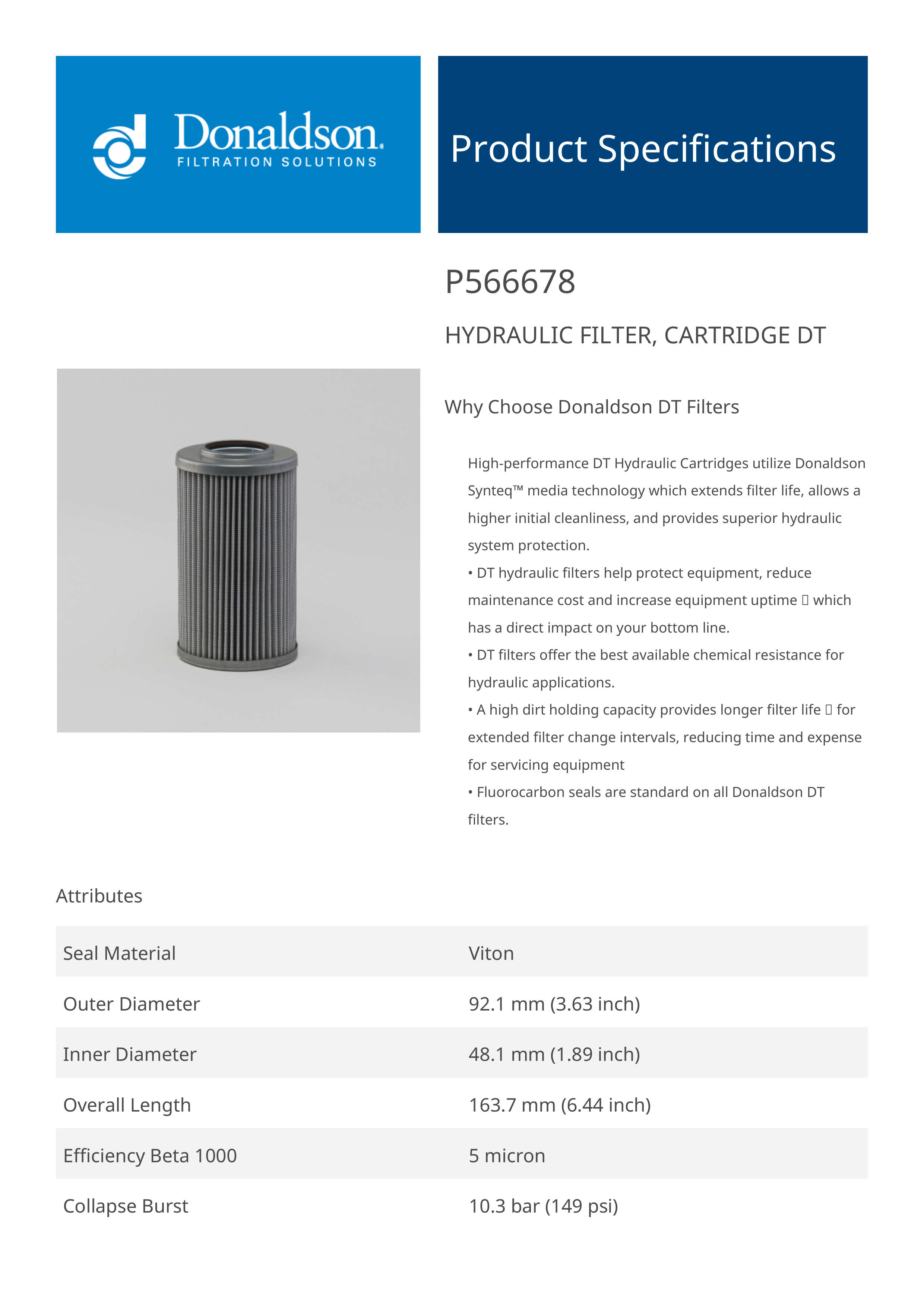Genuine Donaldson P566678 Hydraulic Filter, Cartridge Dt is engineered with advanced depth filtration technology, offering enhanced dirt retention and fluid cleanliness. It ensures optimal performance in high-pressure hydraulic systems, effectively protecting critical components from wear and extending system life.