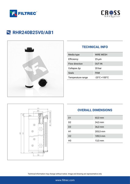 Genuine Filtrec RHR240B25V0/AB1. This Filtrec element is designed to meet or exceed the quality and performance of brand OEM’s ensuring superior filtration performance and long-lasting durability.Engineered with their high performance media and a durable design, the RHR240B25V0/AB1 provides reliable and consistent performance over its lifespan, even in harsh operating environments. When you order from FilterFinder, you can trust that you are getting a reliable and high-quality replacement filter that will keep your system running smoothly.