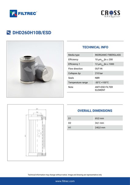 Engineered with their high performance media and a durable design, the DHD260H10B/ESD provides reliable and consistent performance over its lifespan, even in harsh operating environments. When you order from FilterFinder, you can trust that you are getting a reliable and high-quality replacement filter that will keep your system running smoothly.