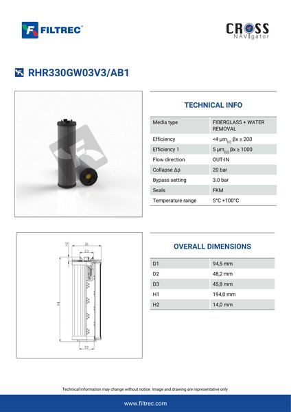 Genuine Filtrec RHR330GW03V3/AB1. This Filtrec element is designed to meet or exceed the quality and performance of brand OEM’s ensuring superior filtration performance and long-lasting durability.Engineered with their high performance media and a durable design, the RHR330GW03V3/AB1 provides reliable and consistent performance over its lifespan, even in harsh operating environments. When you order from FilterFinder, you can trust that you are getting a reliable and high-quality replacement filter that will keep your system running smoothly.