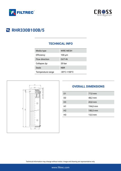Genuine Filtrec RHR330B100B/5. This Filtrec element is designed to meet or exceed the quality and performance of brand OEM’s ensuring superior filtration performance and long-lasting durability.