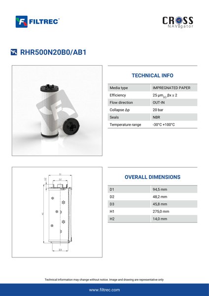 Genuine Filtrec RHR500N20B0/AB1. This Filtrec element is designed to meet or exceed the quality and performance of brand OEM’s ensuring superior filtration performance and long-lasting durability.Engineered with their high performance media and a durable design, the RHR500N20B0/AB1 provides reliable and consistent performance over its lifespan, even in harsh operating environments. When you order from FilterFinder, you can trust that you are getting a reliable and high-quality replacement filter that will keep your system running smoothly.