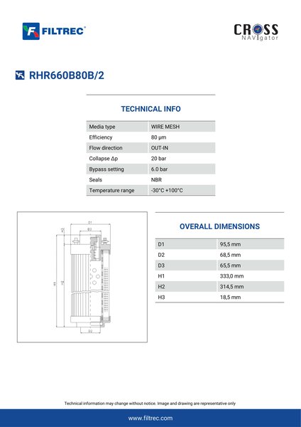 Genuine Filtrec RHR660B80B/2. This Filtrec element is designed to meet or exceed the quality and performance of brand OEM’s ensuring superior filtration performance and long-lasting durability.