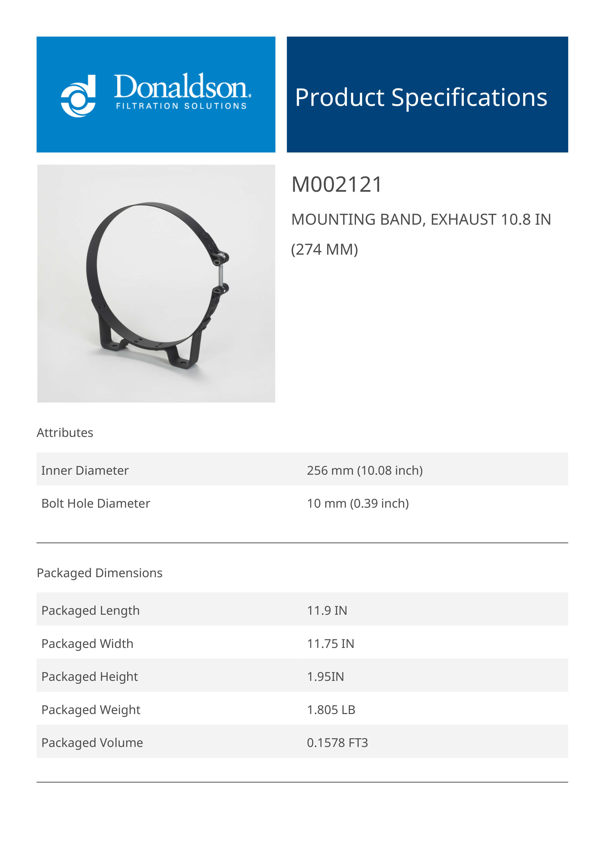 Genuine Donaldson M002121 Mounting Band, Exhaust 10.8 In (274 Mm) is engineered to deliver reliable performance and durability across a wide range of applications. Designed with high-quality materials, it ensures consistent functionality while meeting demanding operational requirements.