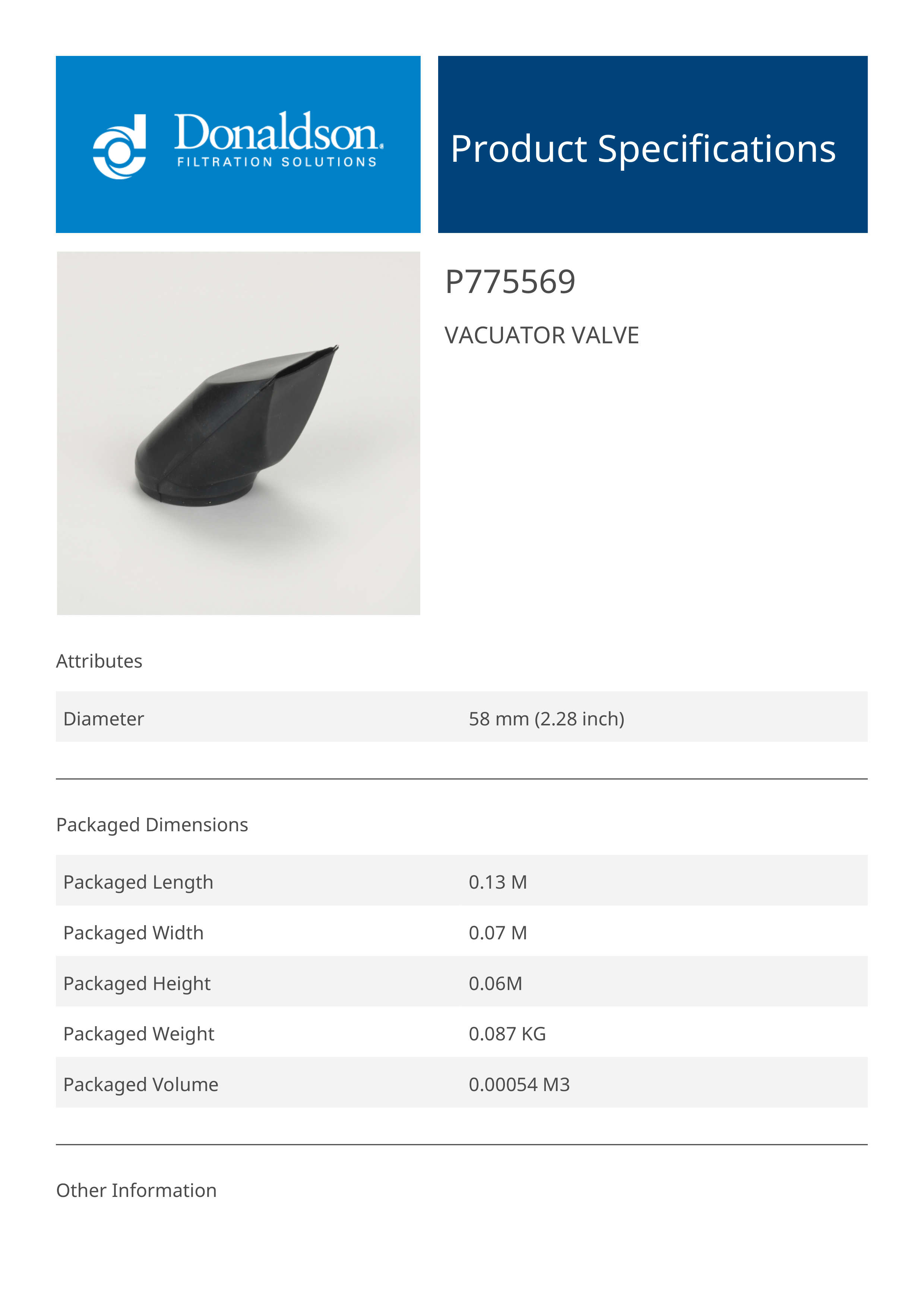 Genuine Donaldson P775569 Vacuator Valve is engineered to deliver reliable performance and durability across a wide range of applications. Designed with high-quality materials, it ensures consistent functionality while meeting demanding operational requirements.Whether used in industrial, automotive, or heavy-duty settings, this component offers dependable operation and longevity. Its versatile design makes it suitable for various uses, supporting system efficiency and overall performance.