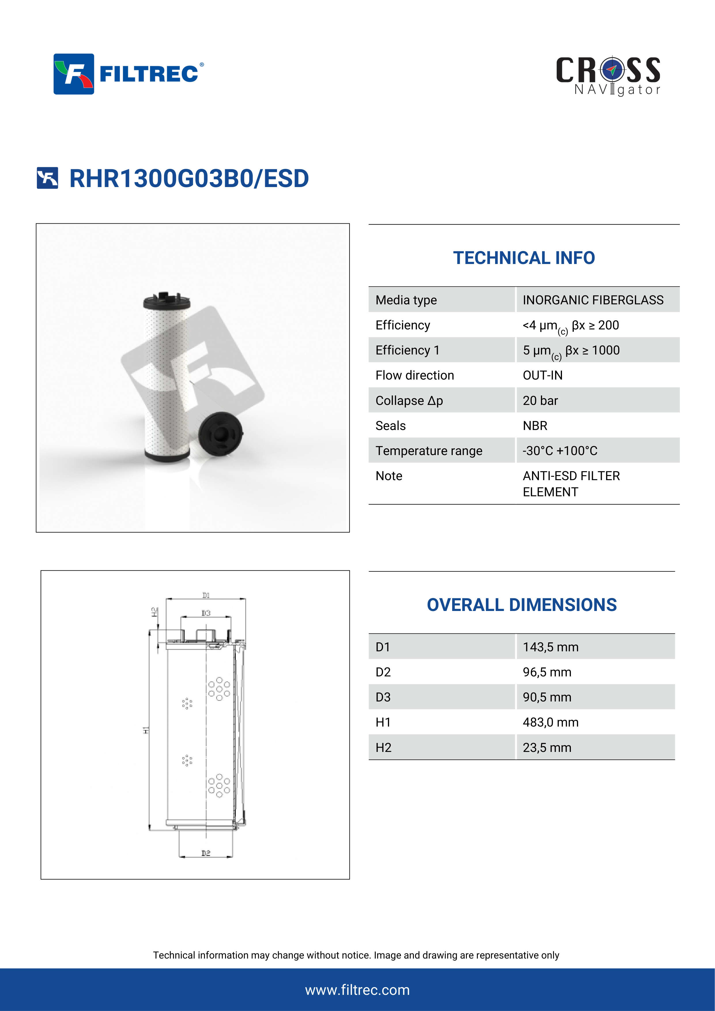 Genuine Filtrec RHR1300G03B0/ESD. This Filtrec element is designed to meet or exceed the quality and performance of brand OEM’s ensuring superior filtration performance and long-lasting durability.Engineered with their high performance media and a durable design, the RHR1300G03B0/ESD provides reliable and consistent performance over its lifespan, even in harsh operating environments. When you order from FilterFinder, you can trust that you are getting a reliable and high-quality replacement filter that will keep your system running smoothly.