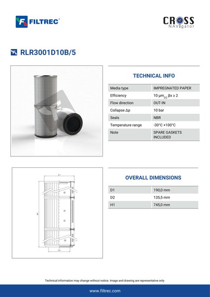 Genuine Filtrec RLR3001D10B/5. This Filtrec element is designed to meet or exceed the quality and performance of brand OEM’s ensuring superior filtration performance and long-lasting durability.