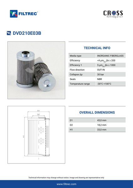 Genuine Filtrec DVD210E03B. This Filtrec element is designed to meet or exceed the quality and performance of brand OEM’s ensuring superior filtration performance and long-lasting durability.