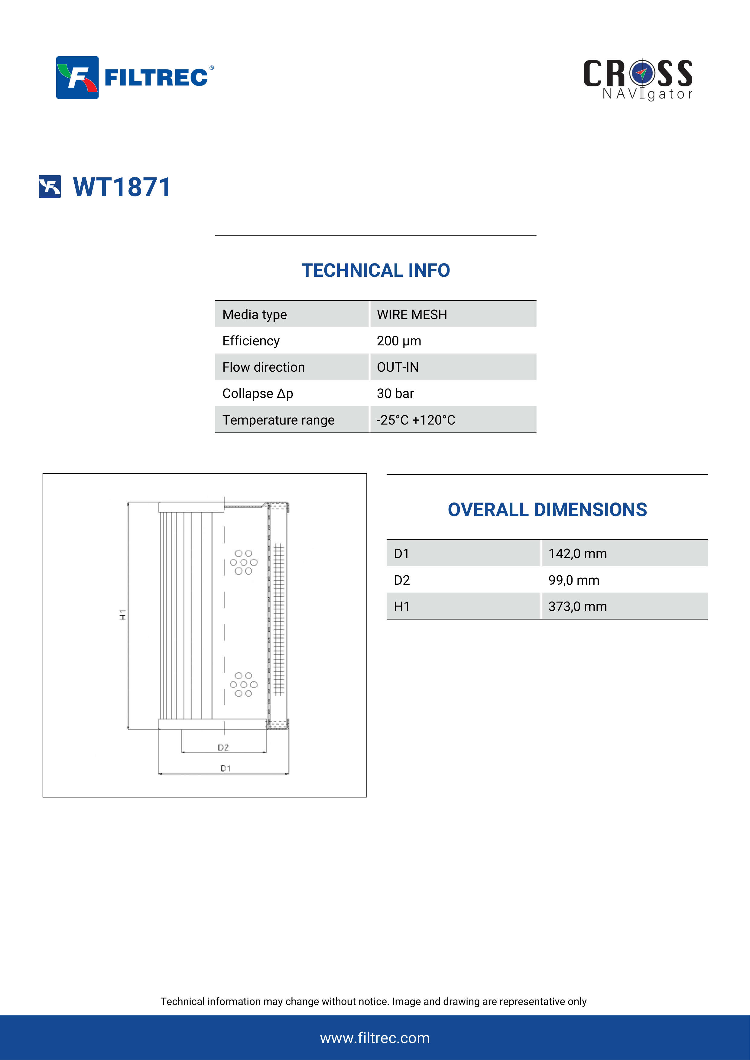 Genuine Filtrec WT1871. This Filtrec element is designed to meet or exceed the quality and performance of brand OEM’s ensuring superior filtration performance and long-lasting durability.