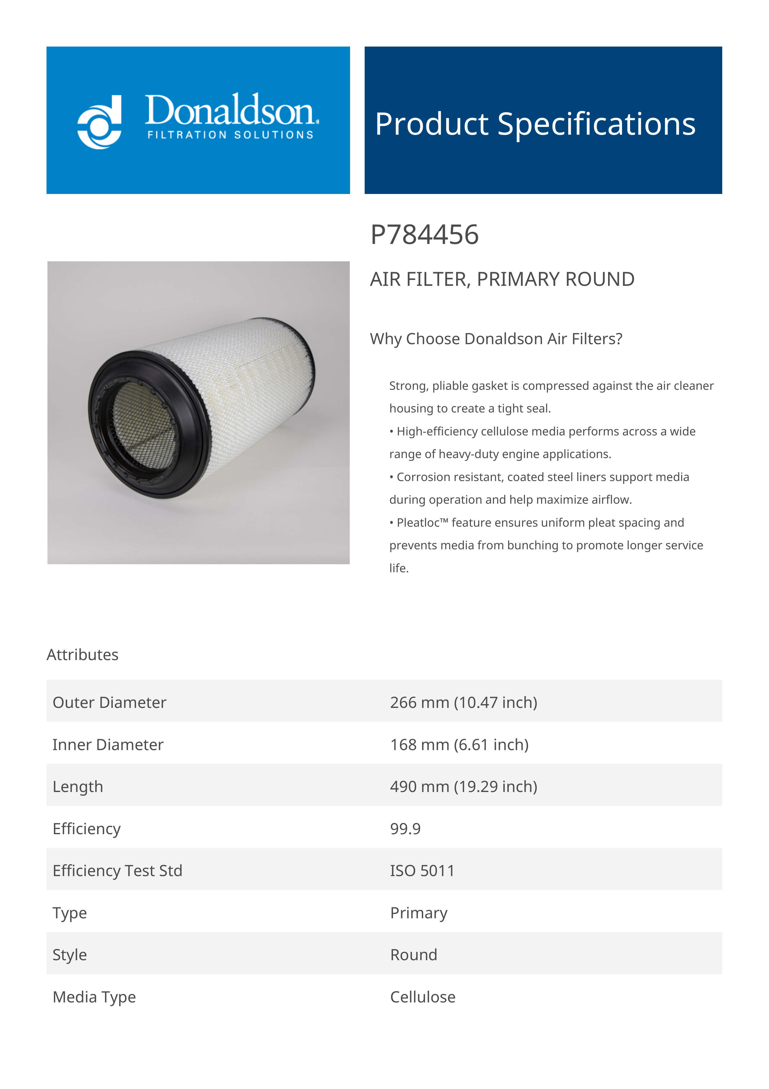 Genuine Donaldson P784456 Air Filter, Primary Round is crafted to provide outstanding engine protection by filtering out dust, dirt, and debris before they reach the combustion chamber. Its round design maximizes airflow while maintaining exceptional filtration efficiency, supporting better fuel economy and engine performance.
