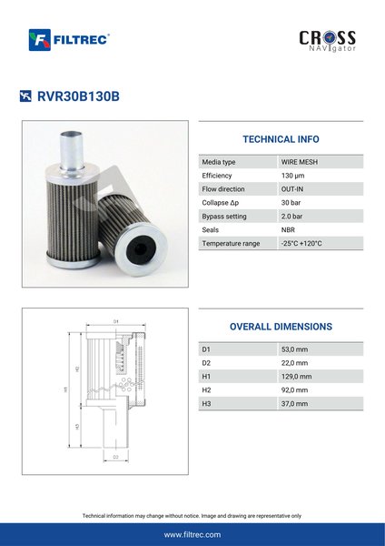 Genuine Filtrec RVR30B130B. This Filtrec element is designed to meet or exceed the quality and performance of brand OEM’s ensuring superior filtration performance and long-lasting durability.Engineered with their high performance media and a durable design, the RVR30B130B provides reliable and consistent performance over its lifespan, even in harsh operating environments. When you order from FilterFinder, you can trust that you are getting a reliable and high-quality replacement filter that will keep your system running smoothly.
