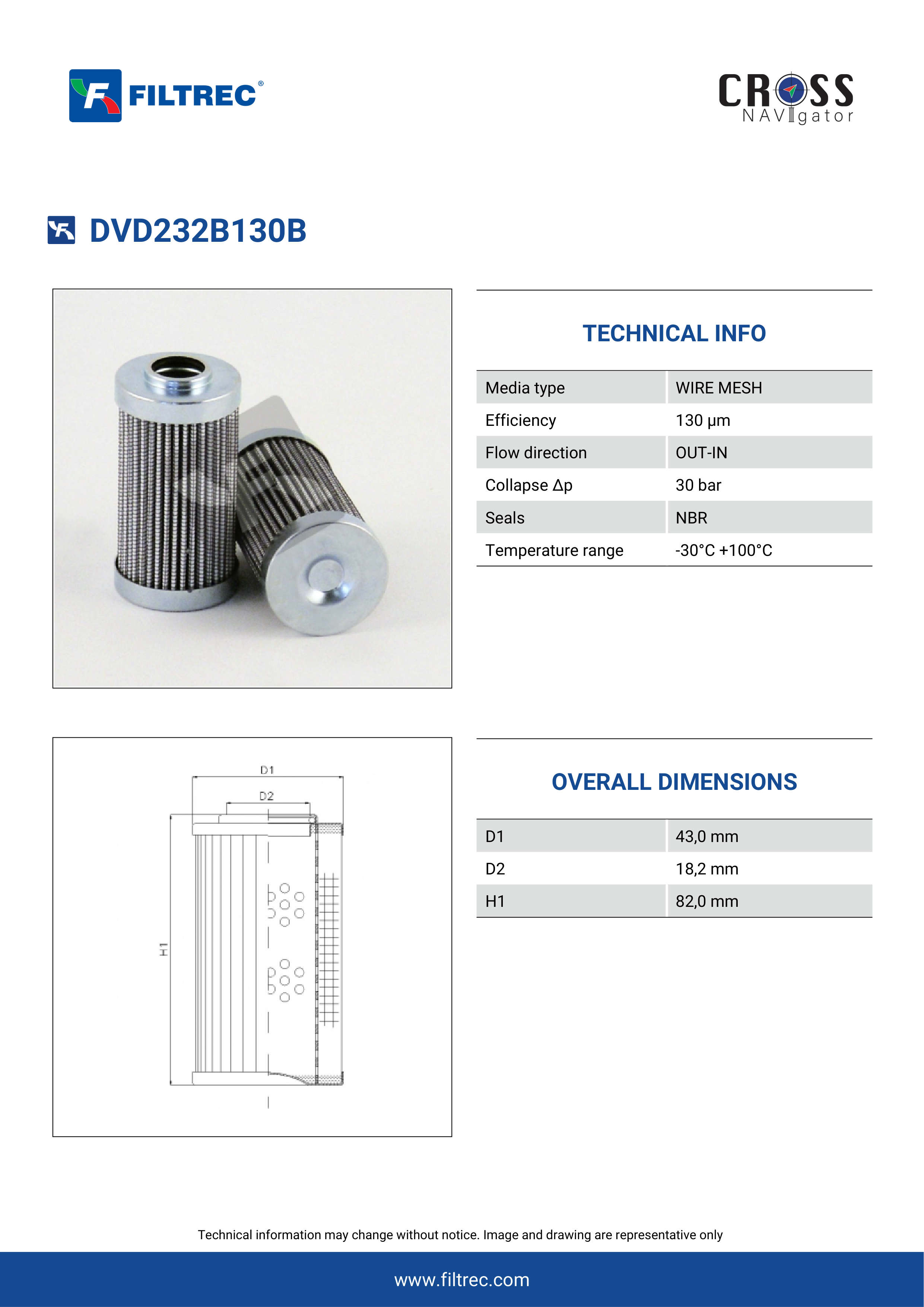 Genuine Filtrec DVD232B130B. This Filtrec element is designed to meet or exceed the quality and performance of brand OEM’s ensuring superior filtration performance and long-lasting durability.