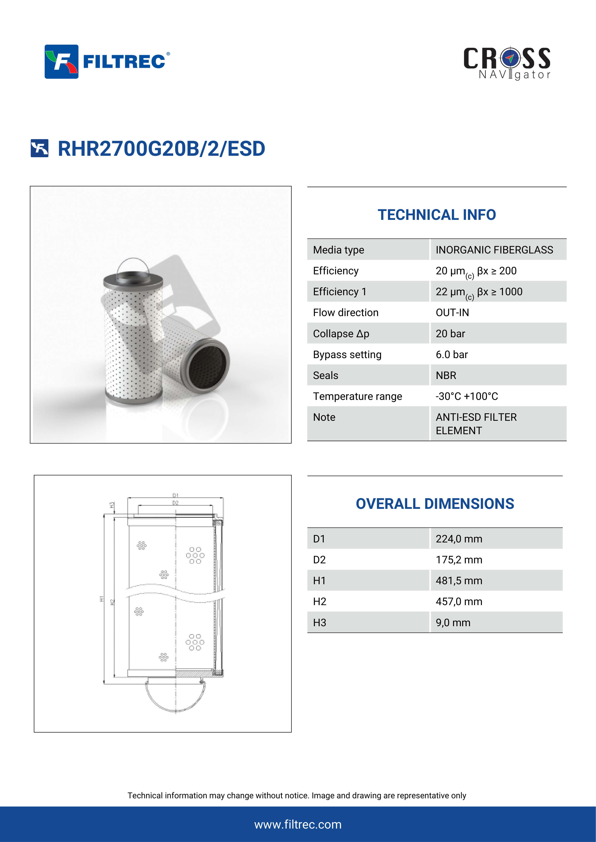 Genuine Filtrec RHR2700G20B/2/ESD. This Filtrec element is designed to meet or exceed the quality and performance of brand OEM’s ensuring superior filtration performance and long-lasting durability.Engineered with their high performance media and a durable design, the RHR2700G20B/2/ESD provides reliable and consistent performance over its lifespan, even in harsh operating environments. When you order from FilterFinder, you can trust that you are getting a reliable and high-quality replacement filter that will keep your system running smoothly.