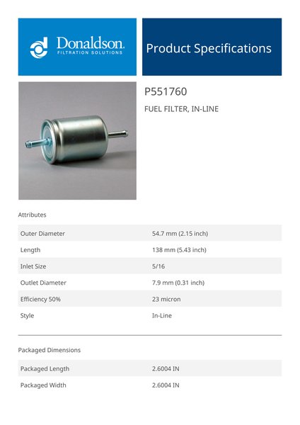 Genuine Donaldson P551760 Fuel Filter, In-Line is engineered to deliver reliable performance and durability across a wide range of applications. Designed with high-quality materials, it ensures consistent functionality while meeting demanding operational requirements.