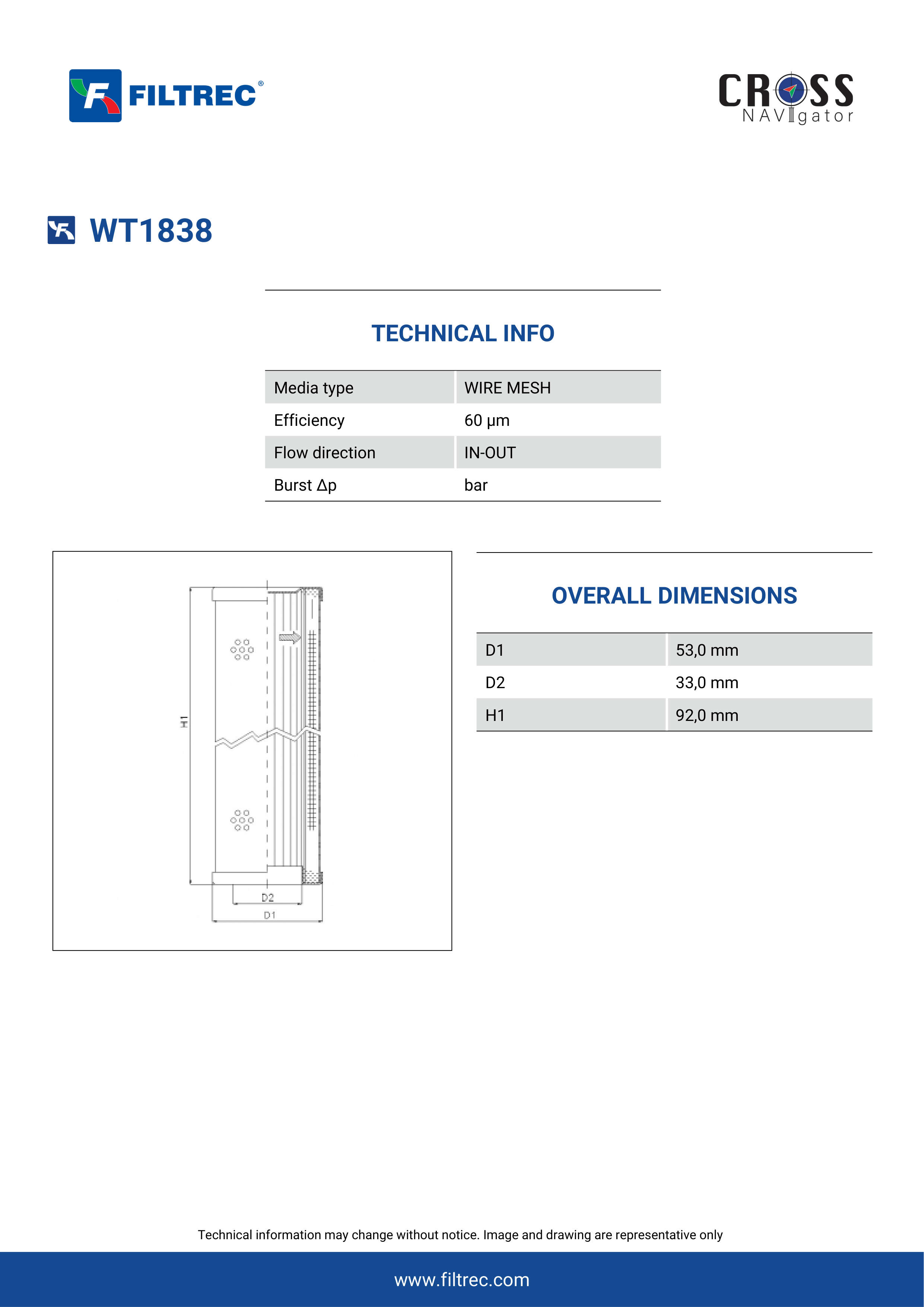 Genuine Filtrec WT1838. This Filtrec element is designed to meet or exceed the quality and performance of brand OEM’s ensuring superior filtration performance and long-lasting durability.