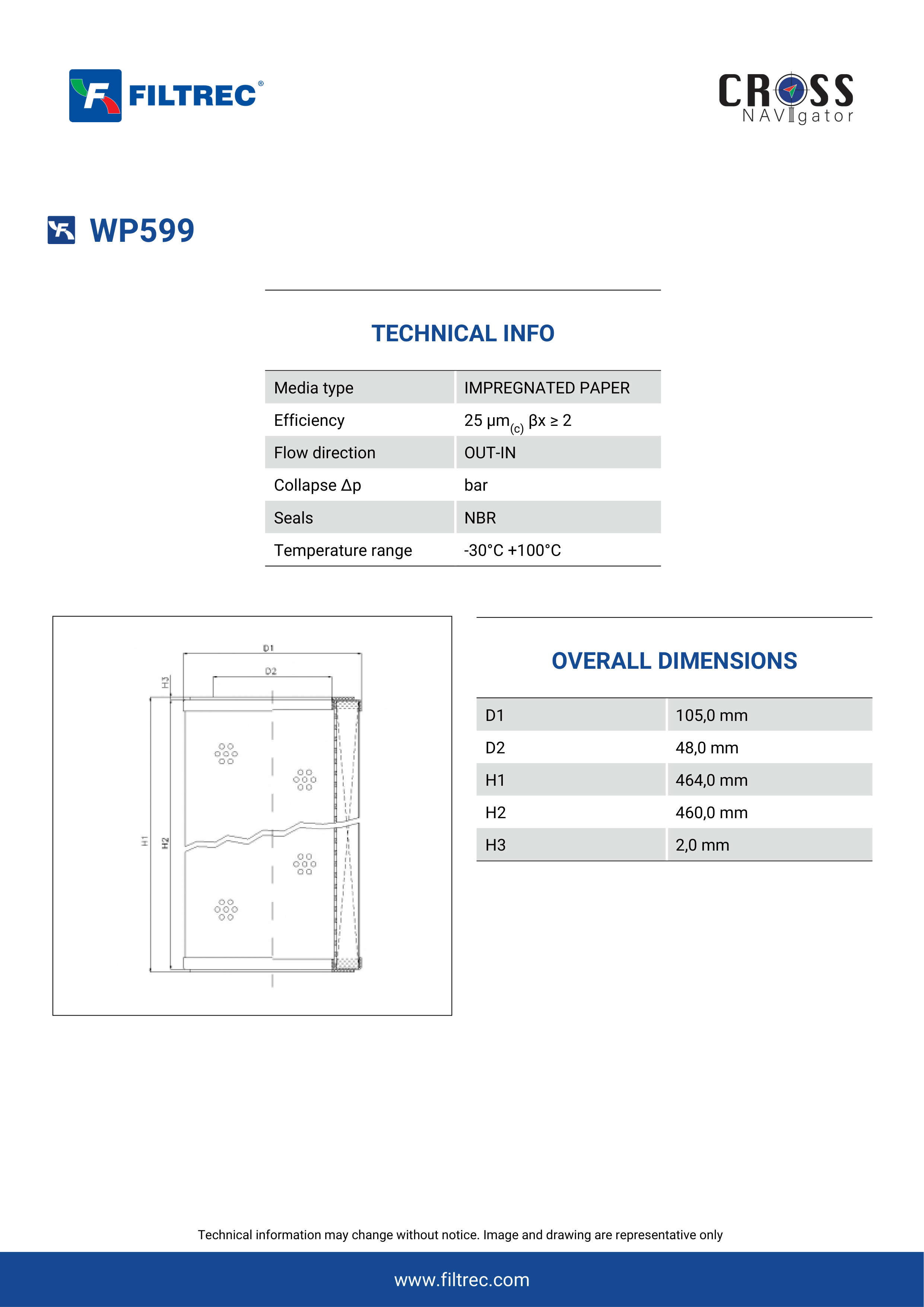 Genuine Filtrec WP599. This Filtrec element is designed to meet or exceed the quality and performance of brand OEM’s ensuring superior filtration performance and long-lasting durability.