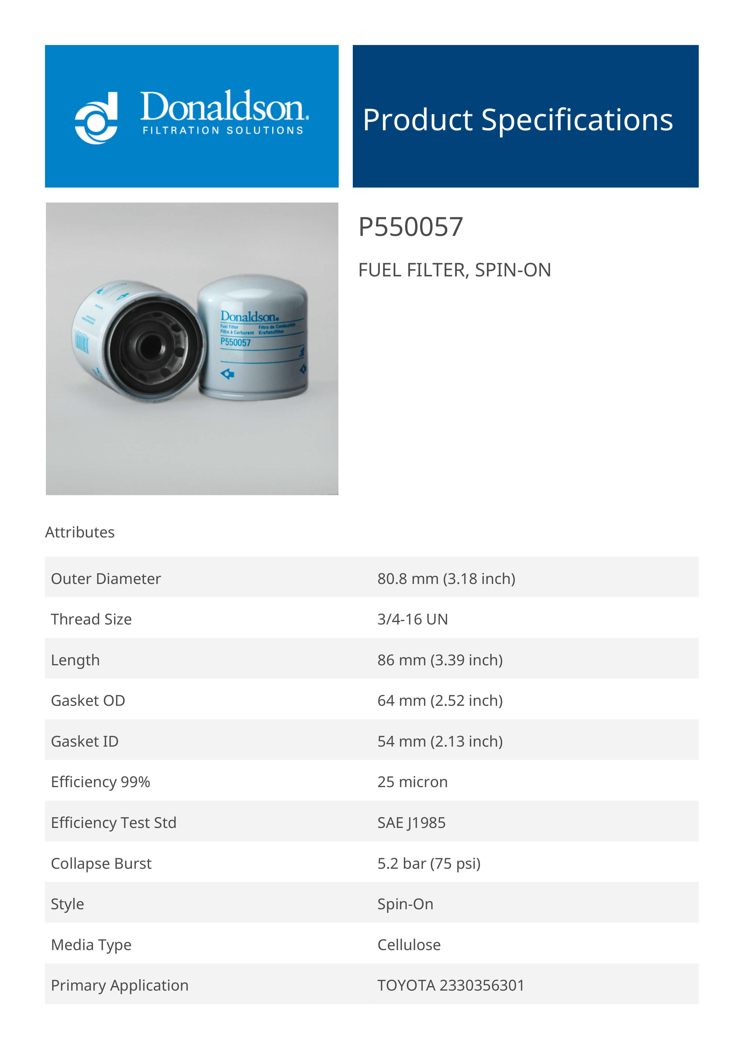 Genuine Donaldson P550057 Fuel Filter, Spin-On is engineered to remove contaminants from fuel systems, ensuring clean fuel delivery for improved engine performance and longevity. Its spin-on design allows for quick and convenient filter changes, reducing downtime during maintenance.