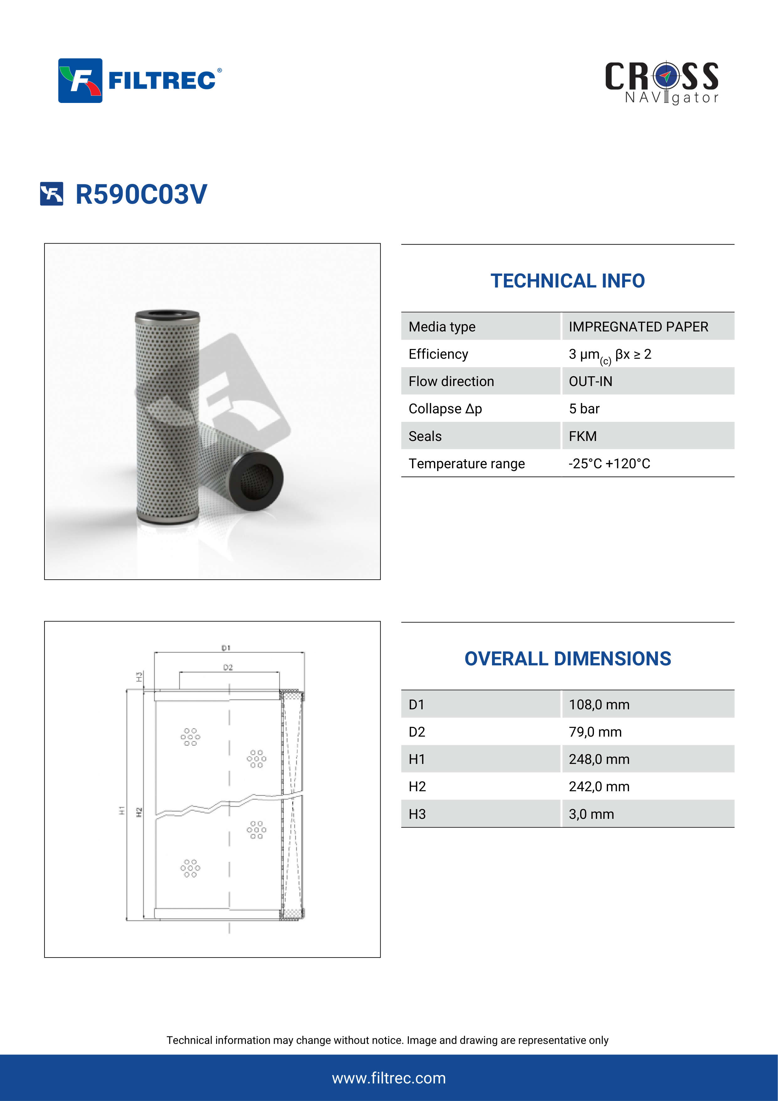 Genuine Filtrec R590C03V. This Filtrec element is designed to meet or exceed the quality and performance of brand OEM’s ensuring superior filtration performance and long-lasting durability.Engineered with their high performance media and a durable design, the R590C03V provides reliable and consistent performance over its lifespan, even in harsh operating environments. When you order from FilterFinder, you can trust that you are getting a reliable and high-quality replacement filter that will keep your system running smoothly.