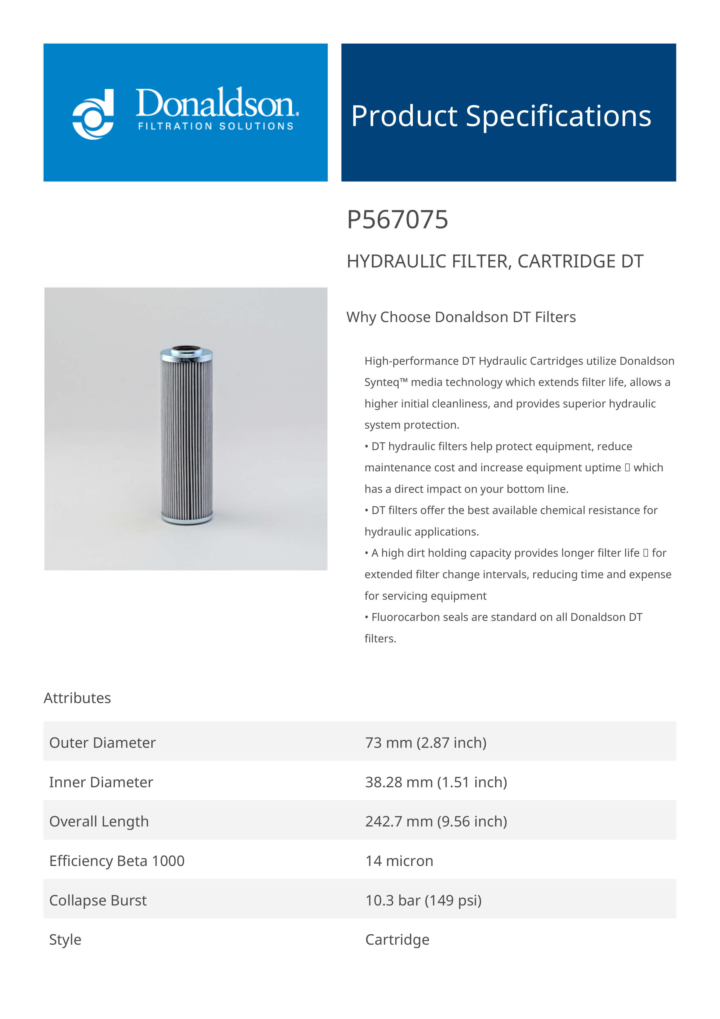 Genuine Donaldson P567075 Hydraulic Filter, Cartridge Dt is engineered with advanced depth filtration technology, offering enhanced dirt retention and fluid cleanliness. It ensures optimal performance in high-pressure hydraulic systems, effectively protecting critical components from wear and extending system life.This filters robust construction and superior filtration efficiency make it ideal for demanding applications. Its reliable performance helps minimize maintenance costs and system downtime, ensuring consistent operation under tough conditions.