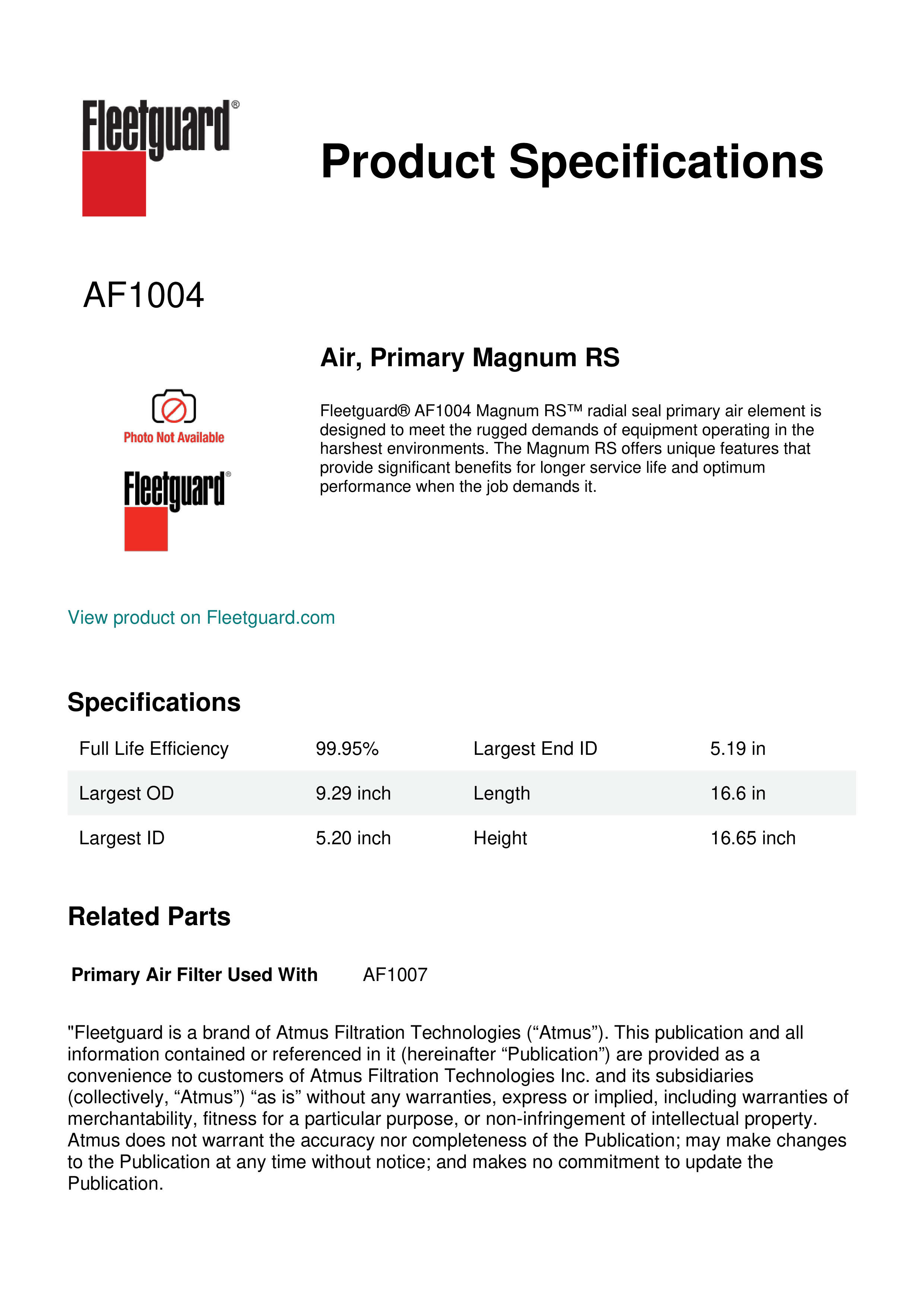 Fleetguard® AF1004 Magnum RS™ radial seal primary air element is designed to meet the rugged demands of equipment operating in the harshest environments. The Magnum RS offers unique features that provide significant benefits for longer service life and optimum performance when the job demands it.Specification