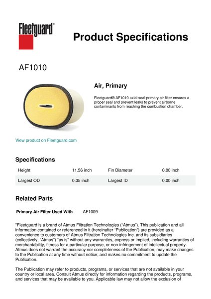 Fleetguard® AF1010 axial seal primary air filter ensures a proper seal and prevent leaks to prevent airborne contaminants from reaching the combustion chamber.Specification