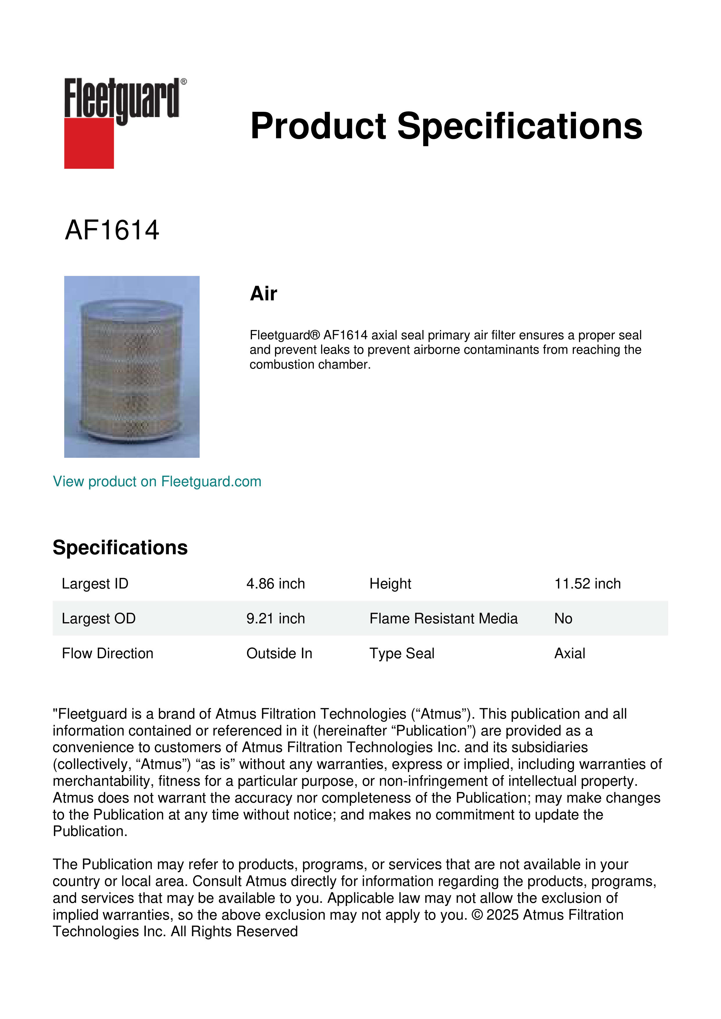 Fleetguard® AF1614 axial seal primary air filter ensures a proper seal and prevent leaks to prevent airborne contaminants from reaching the combustion chamber.