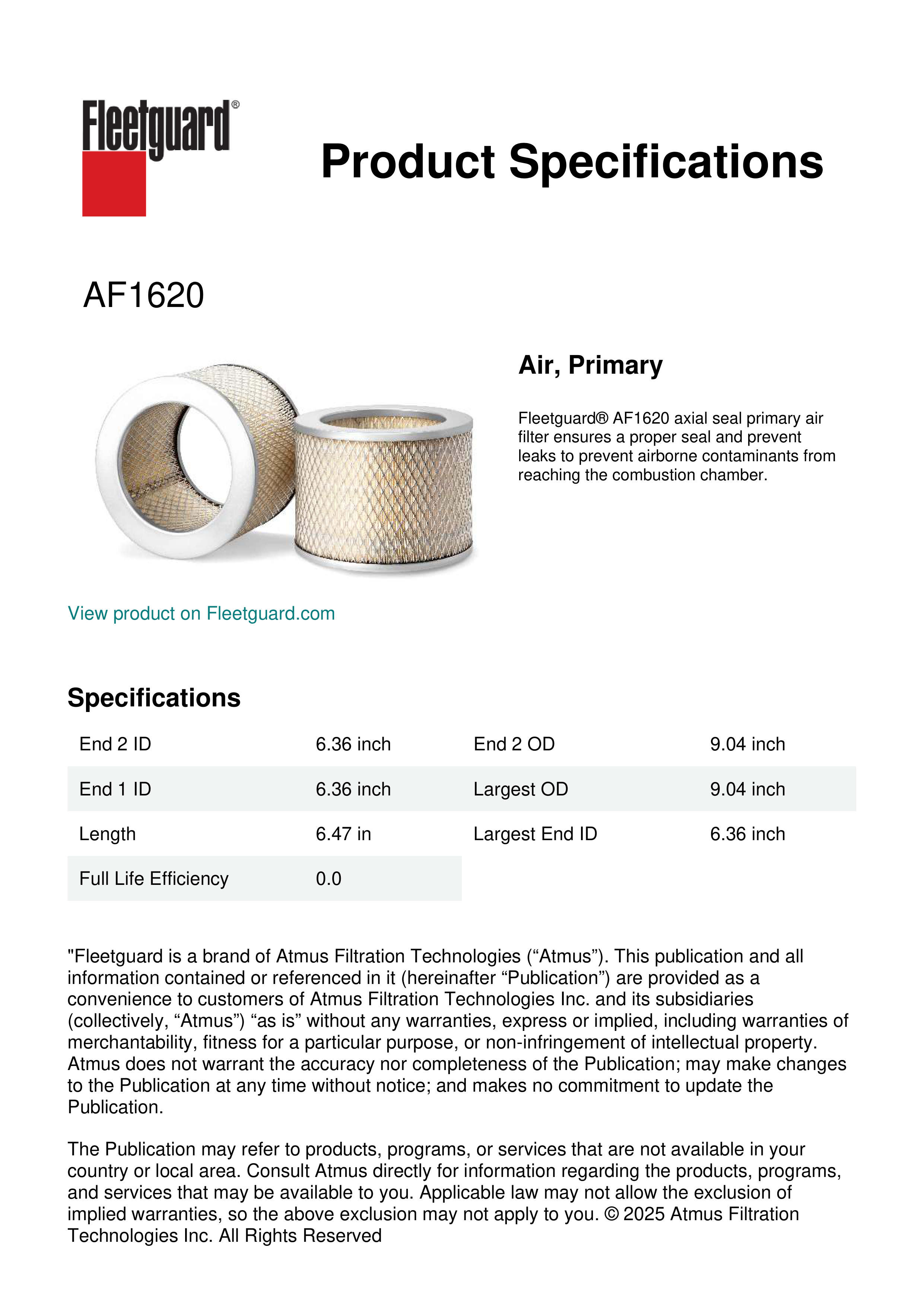 Fleetguard® AF1620 axial seal primary air filter ensures a proper seal and prevent leaks to prevent airborne contaminants from reaching the combustion chamber.