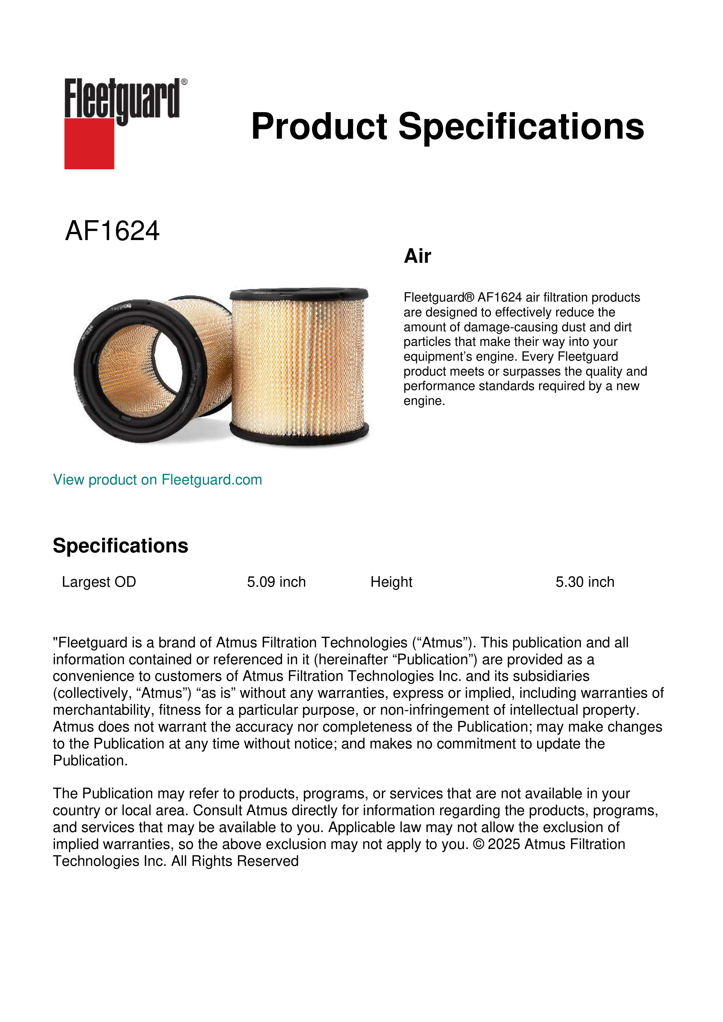 Fleetguard® AF1624 air filtration products are designed to effectively reduce the amount of damage-causing dust and dirt particles that make their way into your equipment’s engine. Every Fleetguard product meets or surpasses the quality and performance standards required by a new engine.Specification