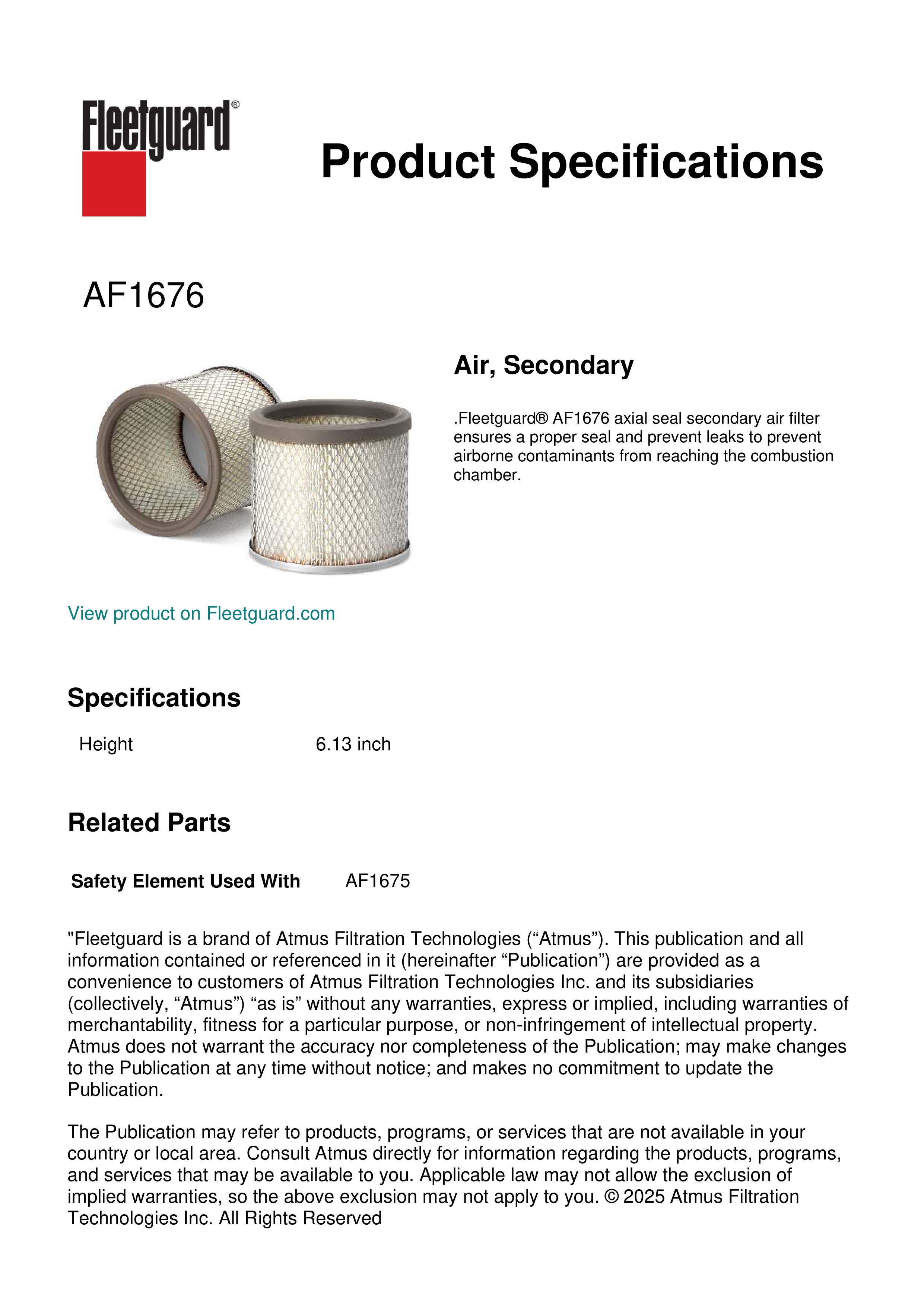 .Fleetguard® AF1676 axial seal secondary air filter ensures a proper seal and prevent leaks to prevent airborne contaminants from reaching the combustion chamber.Specification